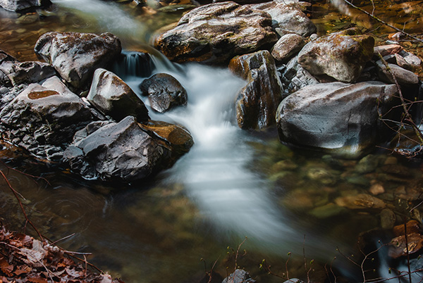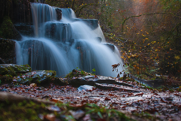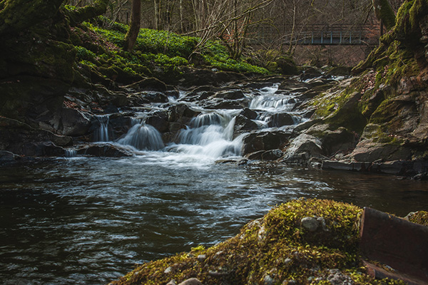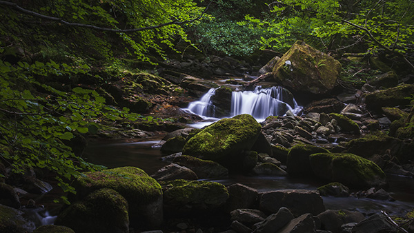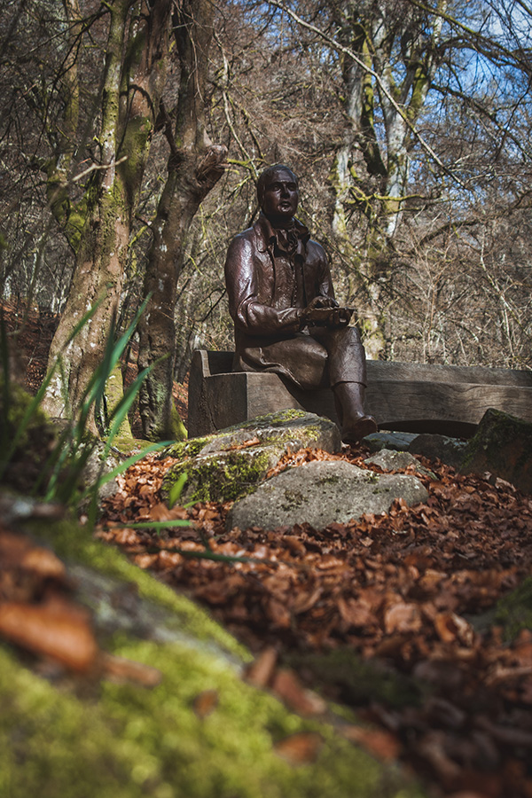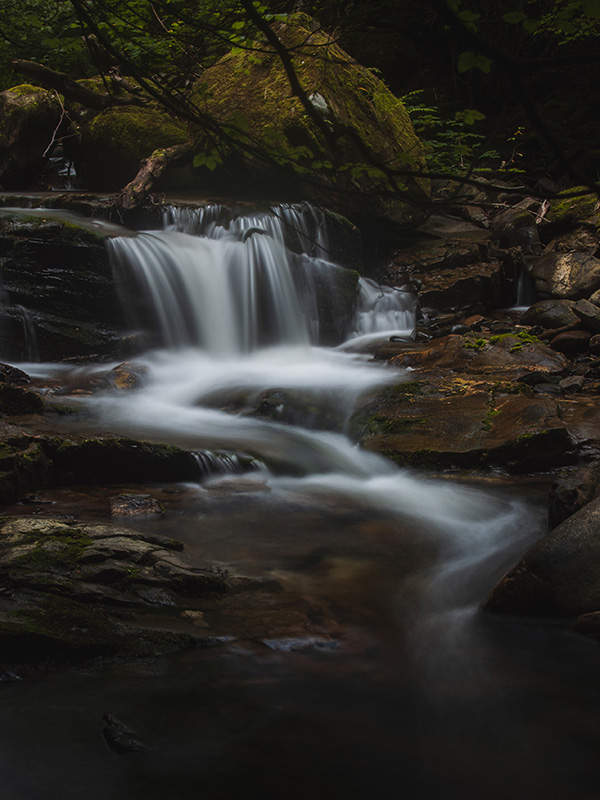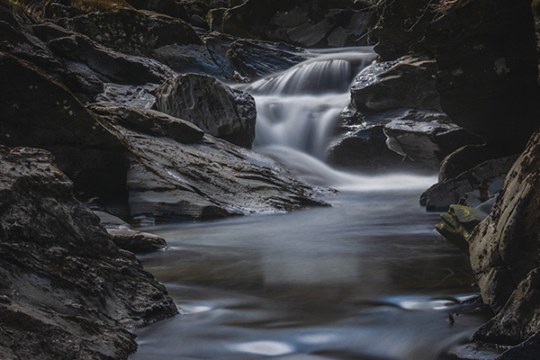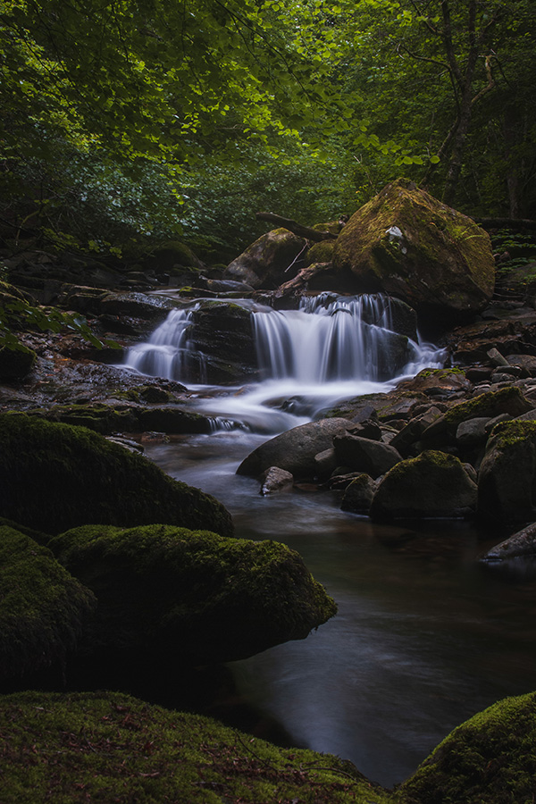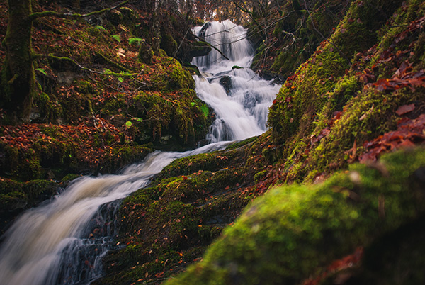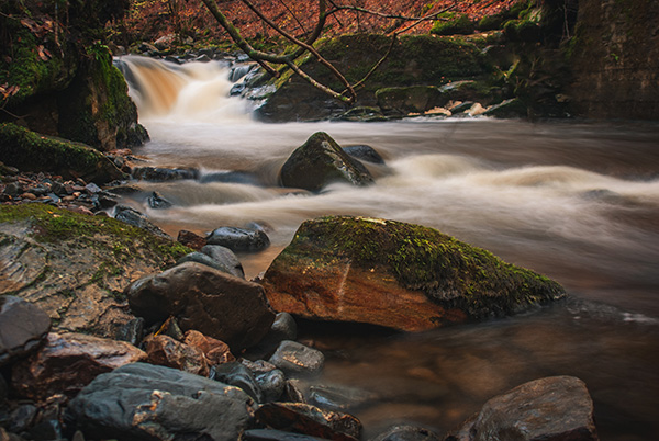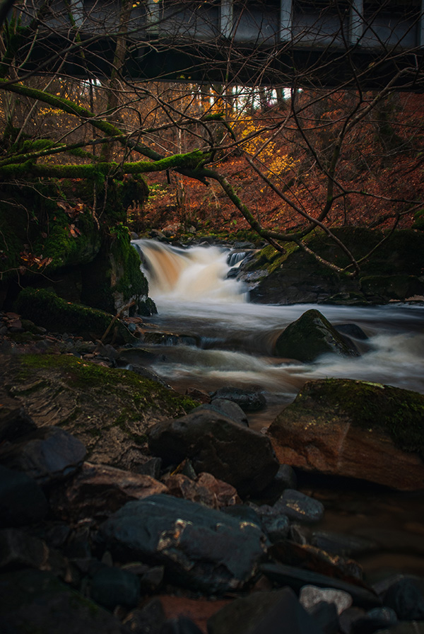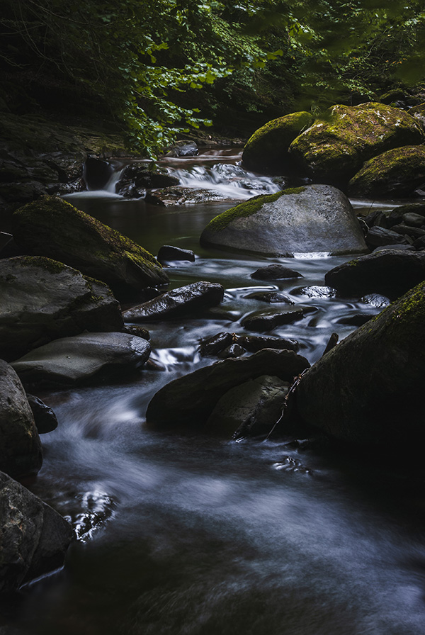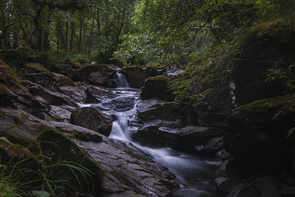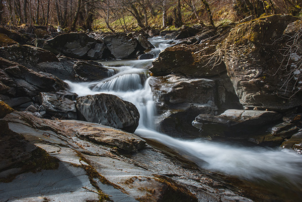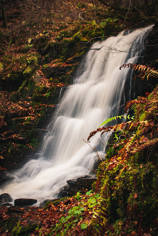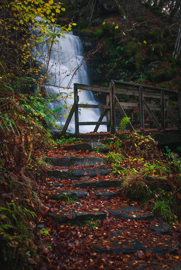 On the western edge of Aberfeldy is a pretty but rather ordinary looking forest. It's only once you head into these woods that you will find what is one of my favourite spots for photography in Scotland. A clear path circles round around a wooded gorge through which the Moness Burn runs. Once called the Den of Moness, it was renamed after the famous Scottish poet Robbie Burns wrote about it in his poem The Birks o' Aberfeldie. A commemorative statue of the man can be found on the walk. Along the walk you will find a number of waterfalls, ranging from delicate branching streams to thunderous cascades. In this case the largest of these, the Falls of Moness, is actually not very easy to photograph because there is only really one point up high along the edge of the gorge from which it can be seen through the trees. Getting near it on the ground level isn't really possible unless you have waders to go through the river. The other, medium sized waterfalls are much easier to photograph and produce some really nice results. There is a brief window in autumn where the leaves change to warmer shades and that it when the setting is at its most photogenic, but even when the vegetation is a vibrant green, the natural beauty of the place is apparent.